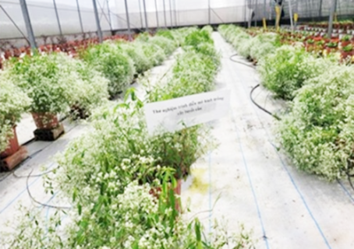 Trồng thử nghiệm hoa tuyết cầu trong nhà màng. Ảnh: NNC