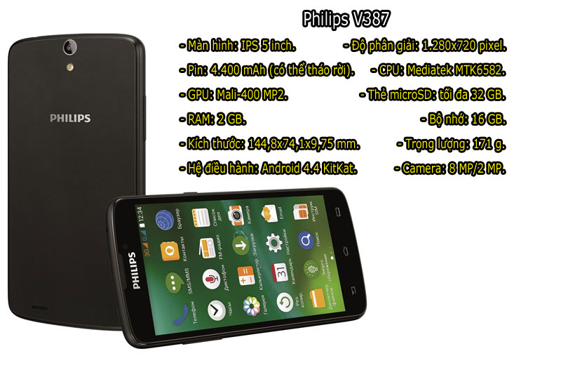 Philips V387 (2,99 triệu đồng). Ở Việt Nam, V387 có 2 tùy chọn màu sắc gồm đen và trắng. Máy sử dụng chất liệu bằng nhựa với nắp lưng có thể tháo rời. Philips V387 được trang bị 2 khe cắm SIM, hỗ trợ kết nối mạng 3G.