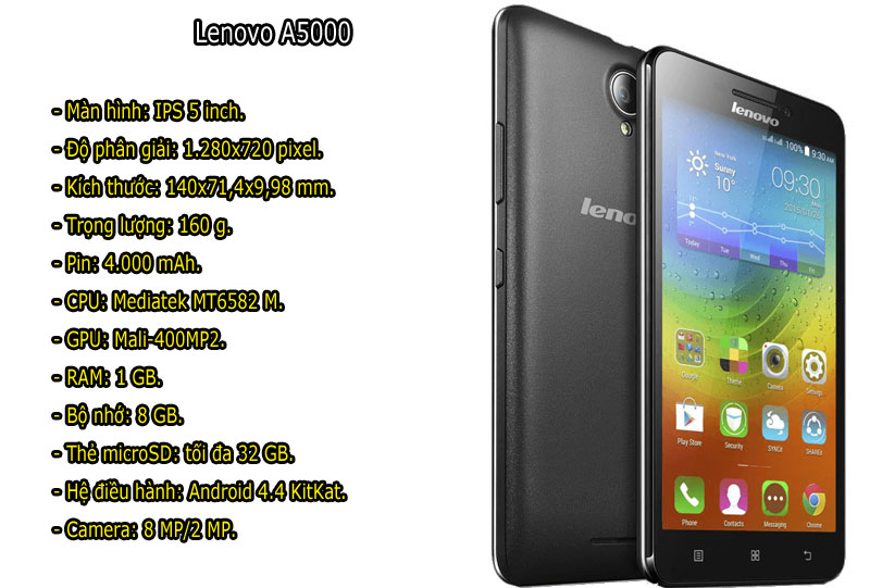 Lenovo A5000 (2,69 triệu đồng). Thiết kế vốn không phải là ưu điểm nổi bật của Lenovo A5000. Máy cũng chỉ có 2 tùy chọn màu sắc là đen và trắng. Đồng thời, A5000 cũng hỗ trợ 2 khe cắm SIM nhưng chỉ có thể kết nối mạng 3G.