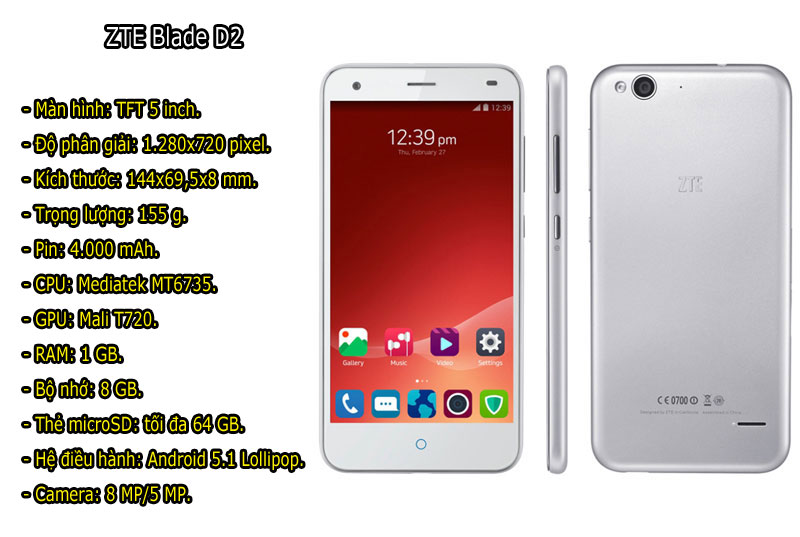 ZTE Blade D2 (2,69 triệu đồng). Ngoài ưu điểm về dung lượng pin, cả 2 SIM của Blade D2 đều có thể kết nối mạng 4G. Model này có 2 màu sắc gồm vàng và trắng.