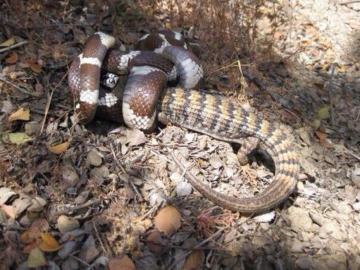 con thằn lằn há miệng cắn vào mình con rắn vua.