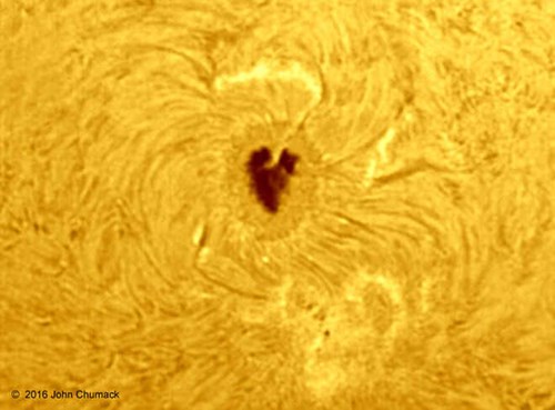 Hình ảnh về trái tim màu đen nay được nhiếp ảnh gia John Chumack phát hiện trên bề mặt Mặt trời vào ngày 12/4/2016 tại Đài Quan sát Thiên văn sân sau tại Dayton, bang Ohio. Theo các chuyên gia nhận định, nguồn gốc xuất hiện trái tim màu đen là do khu vực có nhiệt độ thấp hơn một chút so với khu vực xung quanh, đây cũng là nơi thường xuyên xảy ra các hiện tượng phun trào nhật hoa mọi cấp độ khiến gió Mặt trời giật lên tới hàng triệu dặm /giờ. (